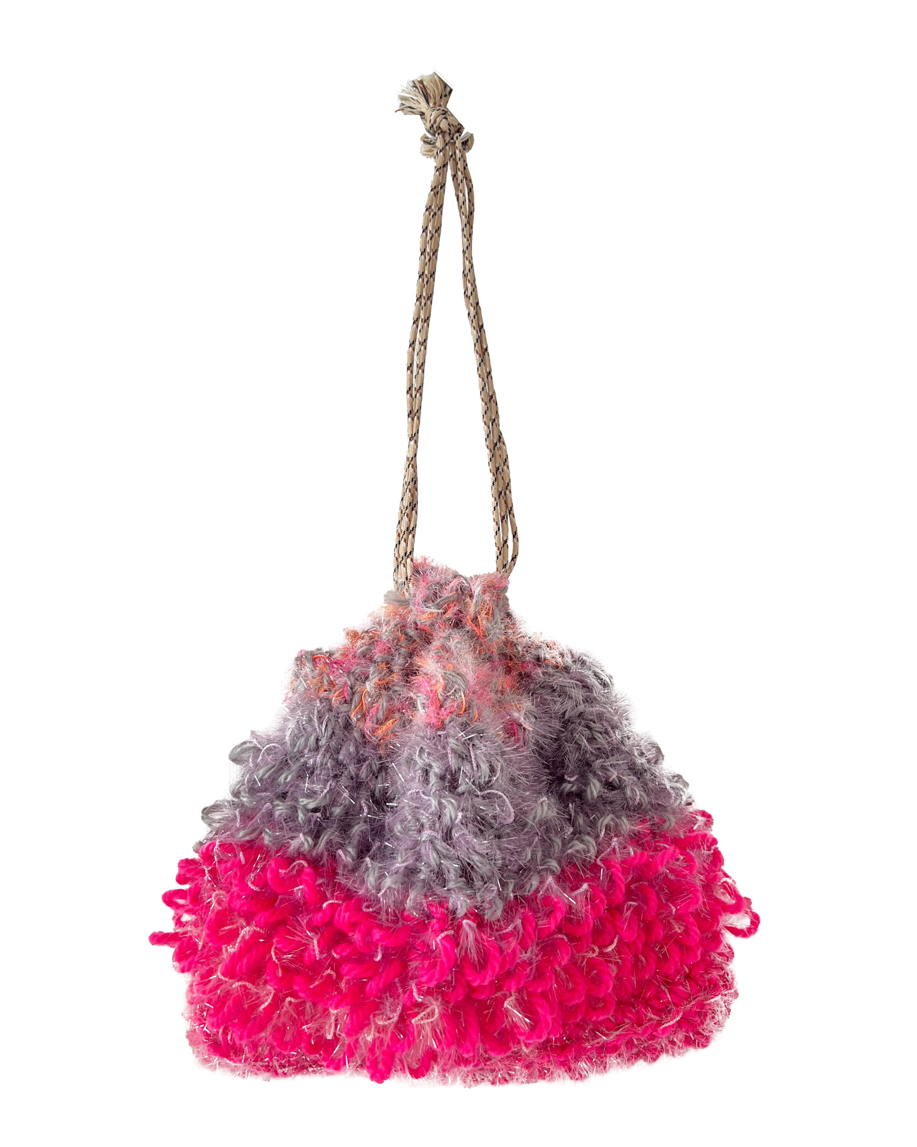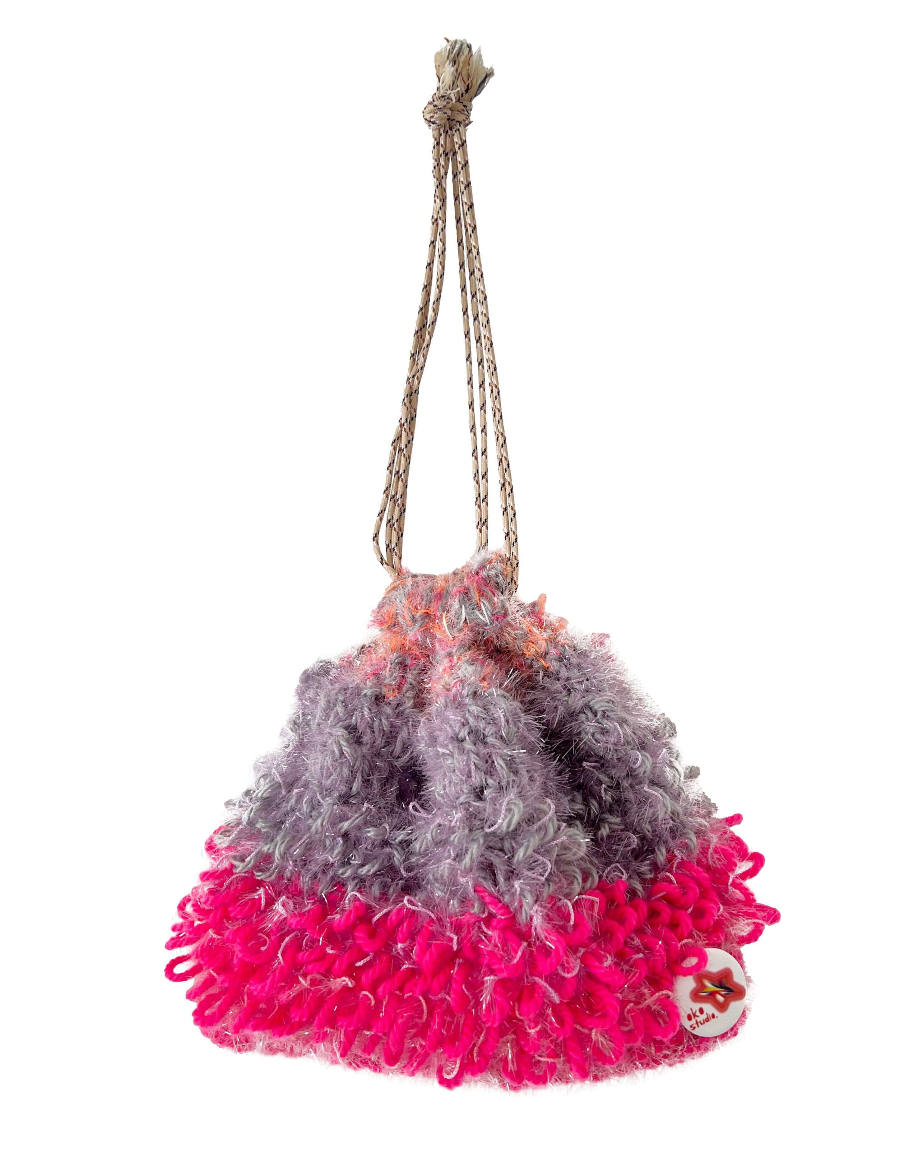 ニュアンスカラーが目を惹く、手編みの巾着バッグです。