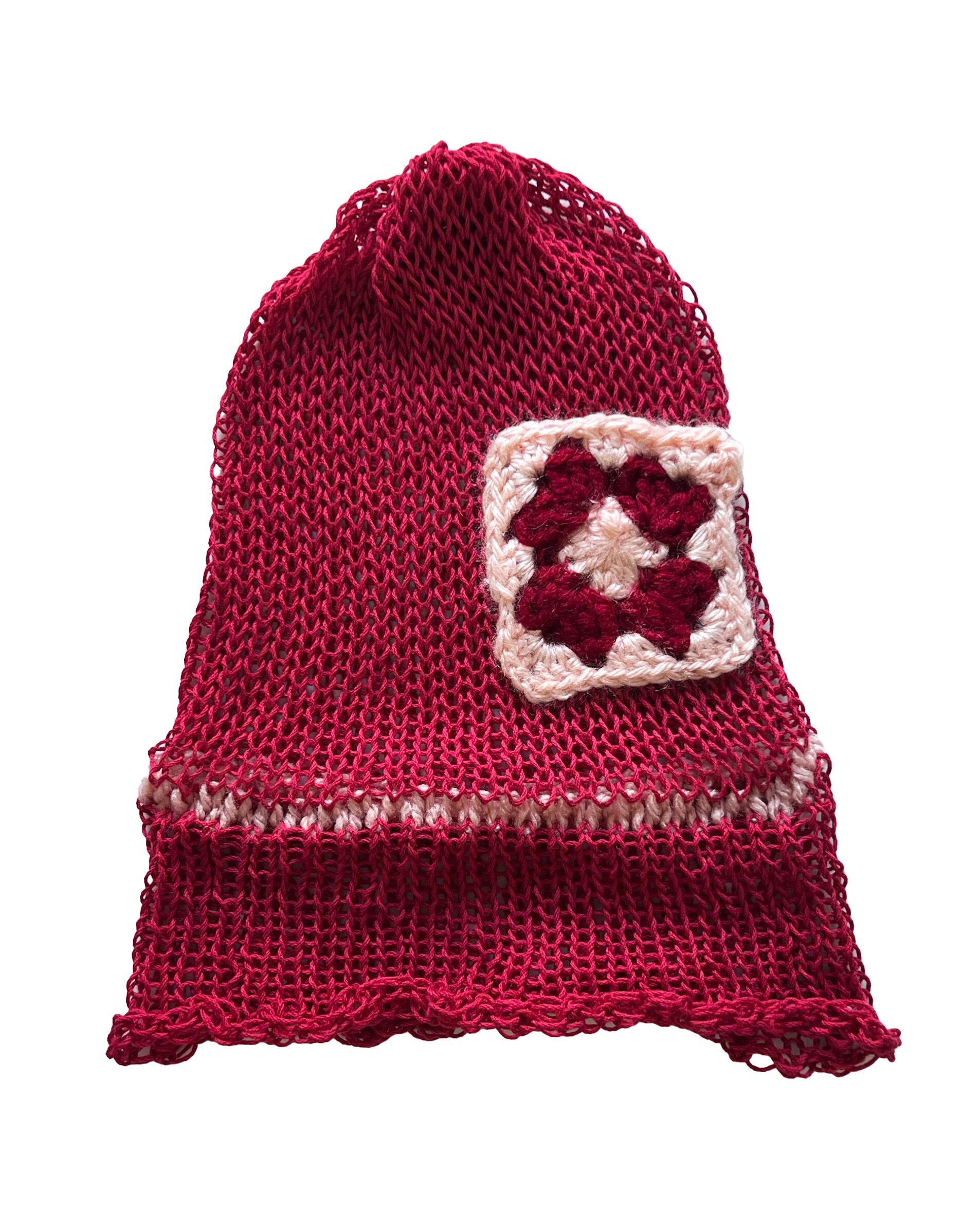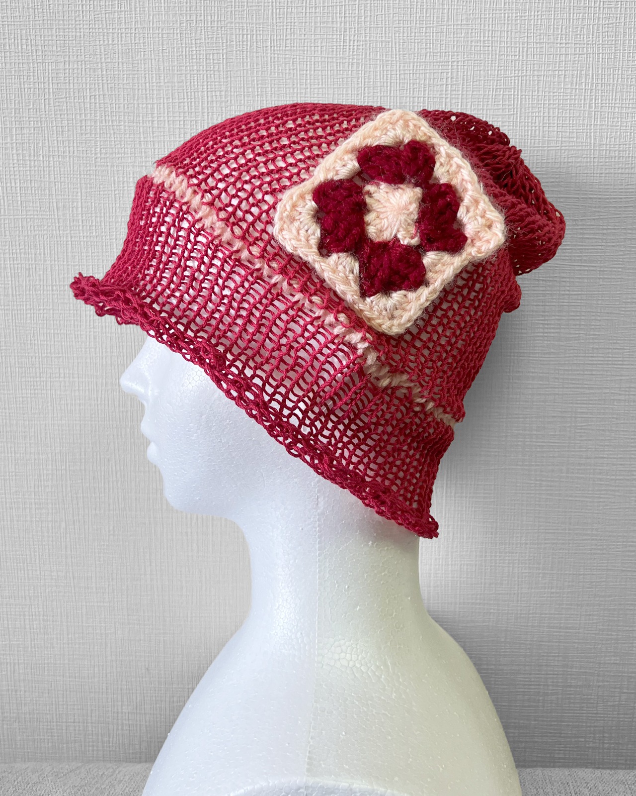 特徴: 鮮やかな赤と、グラニースクエアがポイントのレトロなニットビーニー。