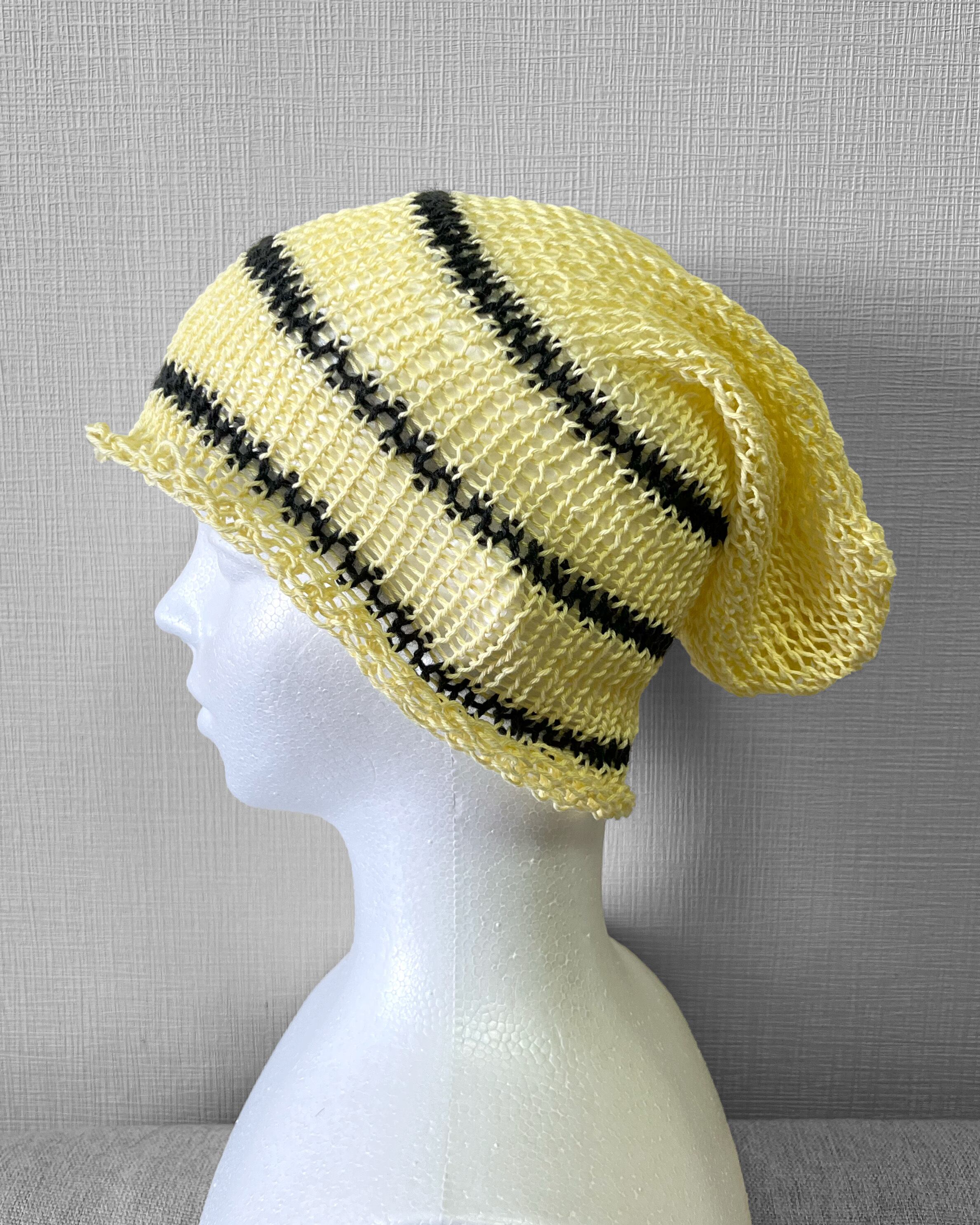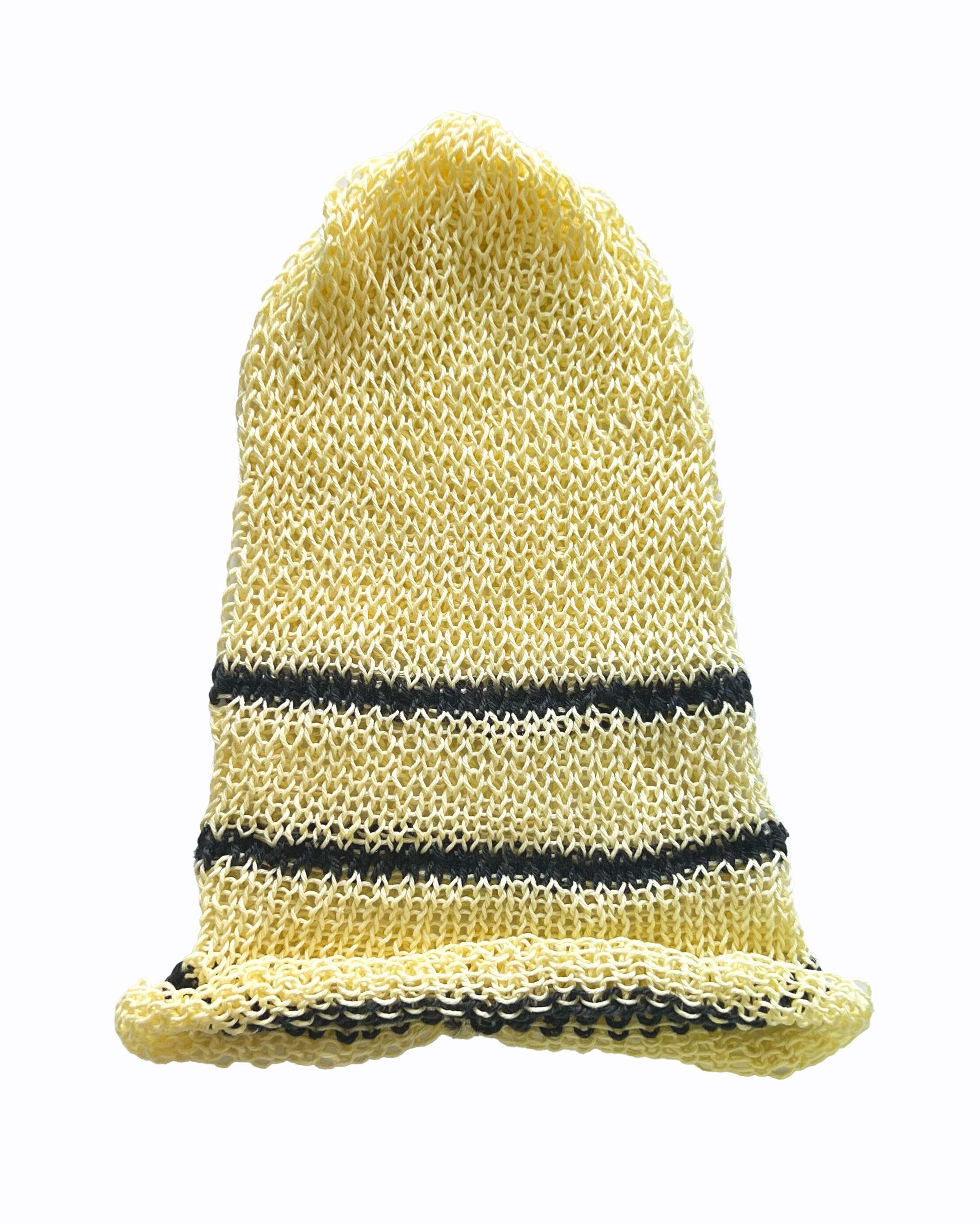特徴: レモンイエローにブラックのラインが入ったシンプルなデザイン。通常のビーニーよりトップが長めになっています。